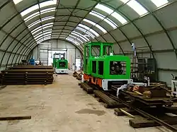 In 2014, the Society discovered that two of the original Schoma locomotives that had worked on the moors were for sale by a dealer based in Norfolk. Two visits were made to inspect them, the second on 16 February 2015, after which a price was agreed, although the locomotives, together with three slave units, remained at the premises of the dealer Ray King until a suitable location could be found to store them.[16] The Poly-Peat site was now owned by North Lincolnshire Council, and became the base for the operation, while the Society was renamed Crowle Peatland Railway. They received funding of £10,000 from North Lincolnshire Council and the Isle of Axholme and Hatfield Chase Landscape Partnership to fund the restoration of the locomotives. The Partnership obtained a grant of £1.84 million from the Heritage Lottery Fund, which benefitted a number of local projects, including the railway.[17] The Schoma locomotives were moved from Norfolk to a Romney hut, also used as covered accommodation for a herd of goats, on 10 May 2016, and were subsequently joined by the Simplex.[16] The Society then received a grant of £23,000 from the SSE Keadby Grange Windfarm, to finance the construction of a new Romney hut, to act as a workshop for the project[17] Planning permission for the building was granted on 30 June 2017[18] and the Schoma locomotives were moved into the completed building on 5 September 2018.[16] Meanwhile, the Simplex locomotive was moved to North Lindsey College, for engineering students to carry out the restoration work as part of their course.[19]