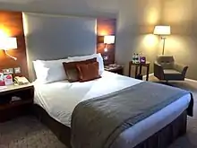 Crowne Plaza was established in 1983 as a breakout brand formed as the upscale sister brand to Holiday Inn.[3] The first Crowne Plaza by Holiday Inn hotel opened that year in Rockville, Maryland.[4] In 1988, Bass PLC (today InterContinental Hotels Group) purchased Holiday Corporation and in 1994 the brand was renamed Crowne Plaza Hotels.[5] In 1999, Crowne Plaza opened its first European property, in Madeira, Portugal.[6]