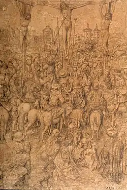 Crucifixion is a recently discovered early-15th-century drawing of the death of Jesus attributed to Jan van Eyck or his workshop,[2] now in the collection of the Museum Boijmans van Beuningen.[3] It is variously dated to the early 1430s, implying an original van Eyck, or c. 1440, making it a pastiche by a workshop member after Jan's death.[2] The only other known van Eyck drawing is the Study for Cardinal Niccolò Albergati if the 1437 Saint Barbara is excluded as an unfinished painting, although there are similarities between the two; especially in its perspective, the angle of the observer's point of view, and the shadings of the rock formations. The quality of draftsmanship is of the first rate, and it is perhaps the most elaborate and complex surviving drawing from the 16th century.[2]