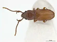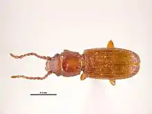 Cryptolestes is a genus of beetles in the family Laemophloeidae. Several species are known as economically important pests of stored products, especially food grains. The four most notorious species are Cryptolestes ferrugineus, Cryptolestes pusilloides, Cryptolestes pusillus, and Cryptolestes turcicus.[1] C. capensis, C. klapperichi, and C. ugandae are less widespread pests.[1] Species in this genus can be hard to distinguish from one another, and definitive identification often requires close examination of the genitalia.[2]