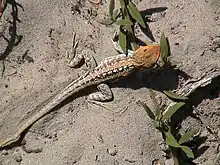 Like most agamids, painted dragons are swift-moving reptiles, capable of impressive sprints over short distances.[8] This diurnal (day-active) lizard, like the majority reptiles, is an ectotherm meaning that it has to rely on its environment to regulate body temperature and as a result will spend considerable time basking to absorb heat.[9] Known to be especially fond of low vegetation and ground debris such as fallen logs and branches,[5] it occupies short burrows often concealed at the base of shrubs such as saltbush.[4][6] Unlike the majority of other agamids which like to perch in elevated places,[8] this species prefers to rest on low branches,[4] from which it will forage over the surrounding open areas and ground litter.[4][5][6] When disturbed or alarmed it will quickly retreat to the safety of the nearby burrow.[6]