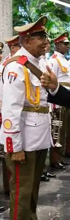 It was founded on 1 April 1960, by order of Juan Almeida Bosque, at the request of Ernesto "Che" Guevara, who was then the President of the National Bank of Cuba. It was a descendant of the Havana Infantry Regiment Band (Banda de Música del Regimiento de Infantería de La Habana). It plays an important role in providing accompaniment for military parades that take place on Revolution Square on January 2. This group is also present at ceremonial activities on the island.[2][3][4] In May 2007, the band took part in the welcoming of the Capitán Miranda of the National Navy of Uruguay at Havana Harbor.[5] During the state visit of President Barack Obama to Havana, Obama greeted Ney Miguel Milanes Gálvez and praised the band for their performance of The Star-Spangled Banner saying that they did a "Good job".[6] During the death and state funeral of Fidel Castro in November 2016, a march was composed specifically for the occasion by the band. The march, known as Eternal Fidel (Eterno Fidel), was composed by Lieutenant Colonel Milanés.[7]