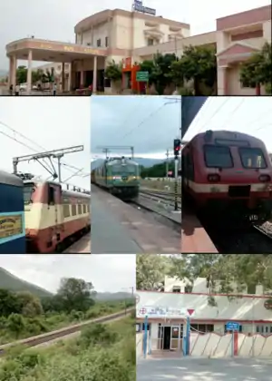 ![]() Montage of Kadapa Railway station. Clockwise, from top to bottom: main entrance; 77402 Hx-Ndl DEMU; Railway Health Unit; scenic view near railway station; 12164 Ms-Dr SF Express halting on platform 3; a WAG-9 hauling freight entering railway station | |