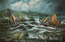 Trawlers entering Aberystwyth, painting by Alfred Worthington (1834–1927) in the art collection of the National Library of Wales.