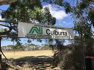 Culburra station was located between Coonalpyn and Tintinara on the Adelaide-Wolseley line, and it was on the Nairne to Bordertown section of the line which opened in 1886.[2] The line opened in stages: on 14 March 1883 from Adelaide to Aldgate, on 28 November 1883 to Nairne, on 1 May 1886 to Bordertown and on 19 January 1887 to Serviceton.[3] However, a station at Culburra was not established until 30 August 1911, when it opened at the 124 mile (later 200 km) mark on the line as Dewson siding.[4] People within the area asked that the station be renamed to Culburra, and the renaming took place on 5 April 1915.[5][6] When the CTC safeworking system was installed on this section of the line, the station was rebuilt with a small brick building similar to those that still exist at Coomandook, Coombe, and Wirrega. Ownership of the station was transferred to Australian National in 1978. It closed on December 31, 1990, when AN ceased all intrastate passenger services in South Australia, and was demolished on 3 March 1993. The station sign was relocated next to the Dukes Highway rest stop in Culburra.