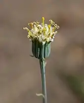 The flower capitulum has no ray florets, and appears at the tip of a slender, erect inflorescence.[4]