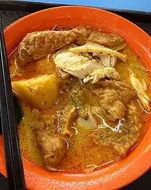 The dish usually contains chicken meat and tau pok. Additional ingredients may contained potatoes or other dishes, depanding on stores.[1] Curry plays an important part in this dish. Usually a more watery curry base is preferred so that the noodles are not hard to swallow.[1]
