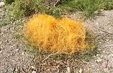 It is an annual plant that grows as a very thin orange-ish parasitic vine, with clumping twinings around the host stems.[2] It parasitizes the host by sending small, short-lived rootlets (haustoria) into its tissues, from which it absorbs moisture and nutrients.[2]