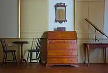 The first floor of the Custom house is organized around a center stair hall located opposite the front door. A custom room and private parlor flank the center hall in the front, while a kitchen with two pantries in a lean-to, a dining room, and a rear staircase are located in the back. Connected to the custom room is another lean-to structure with an exterior entrance that originally functioned as the post office, making the entire south side of the house reserved for Dering's work. The opposite side of the house features a north wing that was once a freestanding structure and was later attached to the main house. It was likely used for additional work-related purposes such as storage for food or goods related to Dering's professional responsibilities. Today, the north wing serves as an apartment. Five bed chambers are located on the second floor.[2]