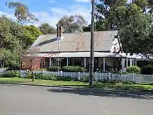 The cottage is a modest timber building with a steeply pitched corrugated iron roof, a verandah to the front (east), an annex with a corrugated iron stove recess and timber porch to the rear (west). This building also appears to have been built in different stages, with the main part of the building being clad in weatherboard, while the annex is clad in chamferboard with externally exposed framing.[1]