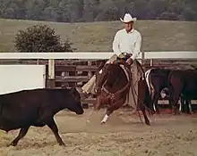 The goal of cutting is to separate a cow from its herd and prevent it from returning. A person riding the horse in competition wears western clothing, including a cowboy hat. The horse is ridden with a western-style cutting saddle and a bridle.
