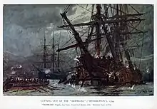 A British frigate, HMS Surprise, was sent under Edward Hamilton to recapture Hermione. In naval terms this was called a cutting out operation—a boarding attack by small boats, preferably at night and against an unsuspecting and anchored target. This had become a popular tactic during the later 18th century.[1][2]