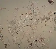 After his return in 1953, Twombly served in the United States Army as a cryptologist, an activity that left a distinct mark on his artistic style.[16] From 1955 to 1959, he worked in New York, where he became a prominent figure among a group of artists including Robert Rauschenberg, with whom he was sharing a studio,[17] and Jasper Johns. Exposure to the emerging New York School purged figurative aspects from his work, encouraging a simplified form of abstraction. He became fascinated with tribal art, using the painterly language of the early 1950s to invoke primitivism, reversing the normal evolution of the New York School. Twombly soon developed a technique of gestural drawing characterized by thin white lines on a dark canvas that appear to be scratched onto the surface. He would apply bitumen on the canvas in a quick and coarse fashion, making the painting tactile and scarred with his energetic, gestural lines that would become his signature style.[18][19] He stopped making sculptures in 1959 and did not take up sculpting again until 1976.[20]