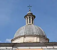 The swirling fresco of the dome was executed by Luigi Garzi in 1684 and depicts The eternal Father in glory among angels. On the side walls are the tombs of Cardinal Alderano and Lorenzo Cybo with marble busts sculpted by Francesco Cavallini. The two bronze putti holding up the main altar and the medallion with the relief portrait of Saint Faustina on the martyr's urn are also his works.