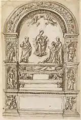 The previous chapel on this site was erected by Cardinal Lorenzo Cybo de Mari, nephew of Pope Innocent VIII, and dedicated to St Lawrence. Giorgio Vasari claimed that the patron was Cardinal Innocenzo Cybo but the dedication over the altar recorded the actual patron. Lorenzo Cybo de Mari was promoted to the cardinalate in 1489. The chapel was constructed during the time between his elevation and his death in 1503.[2] Its architecture was identical to those of the left and right: the Chapel of the Nativity and the Basso Della Rovere Chapel. It was decorated with frescos by Pinturicchio and works by the school of Andrea Bregno which were lost during the later rebuilding. The old fresco of the Virgin and the Child by Pinturicchio was detached from the wall and sent by the cardinal to Massa in 1687. The fragment was re-used as the altarpiece of the Ducal Chapel of the Cathedral of Massa.[3] The very fine funeral monument of Lorenzo Cybo de Mari was transferred to the church of San Cosimato where its fragments are still preserved. It is attributed to Andrea Bregno and Giovanni Cristoforo Romano and was made between 1503 and 1510.