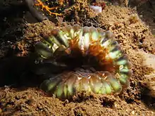 Cynarina lacrymalis is a large, solitary coral with a single polyp nestling in a corallite, the stony cup it has secreted. It can grow to a diameter of 10 cm (3.9 in) and a height of 8 cm (3.1 in).[3] It is cylindrical with a round or oval upper surface. It is usually fixed to rock but has a pointed base and can be embedded in sand or survive unattached. There are twelve broad white radially arranged septa (ridges) joined to the corallite wall, with secondary septa between for a total of 96 septa. The coral's costae (continuations of the septa) alternate between thick and thin depending on the septa they are an extension of.[4] They have large, rounded lobes and the central axial structure (columella) in the corallite is short and broad. The septa can be seen through the transparent, fleshy mantle which contains symbiotic flagellates known as zooxanthellae which give the coral its colour. This is usually pale brown or green, sometimes with a contrasting oral disc, but also sometimes pinkish or bluish.[5] The colour depends on which species of zooxanthella take up residence.[6] The coral has the ability to change its surface from glossy to dull but it is unclear why it does this. At night, when the polyp extends its many tentacles to feed, the coral resembles a sea anemone.[7]