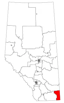 Under the Alberta electoral boundary re-distribution of 2004, the constituency covers the portion of Medicine Hat south of the South Saskatchewan River, the Trans-Canada Highway and Carry Drive. The rest of the city is part of the Medicine Hat constituency, which Cypress-Medicine Hat surrounds. The constituency borders Saskatchewan to the east and Montana to the south. Clockwise from the Montana border, the district also borders Cardston-Taber-Warner, Little Bow, Strathmore-Brooks and Drumheller-Stettler. Other major towns include Bow Island and Redcliff. The constituency represents Cypress County and the County of Forty Mile No. 8.