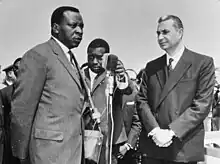 Adoula denounced Portuguese rule in neighboring Angola, which won him favour from the Afro-Asian bloc of non-aligned states.[26] He actively supported the Frente Nacional de Libertação de Angola (FNLA) resistance group throughout his tenure and allowed it to maintain a base in the Congo near the southern border. This was in part attributed to his longstanding personal friendship with FNLA President Holden Roberto; the two had previously been teammates for the Congolese football side Daring Club Motema Pembe.[27] Adoula also had an interest in winning the support of Angolan refugees in Léopoldville, which grew in number after 1961.[28] Furthermore, he hoped to undermine the Portuguese colonial authorities, which were rumored to be supporting Tshombe's efforts in mid-1963 to dislodge his administration.[29] In November of that year his government forced one of the FNLA's chief rivals, the Movimento Popular de Libertação de Angola, to close its Léopoldville offices and drove its leadership out of the city.[30]