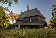 From 1684 to 1688, a Baroque wooden church was erected south of the village at the site of a medieval chapel dedicated to Saint Anne. On 19 August 2005 the building burnt down completely, presumably by an arson attack, but has since been restored in its original condition.