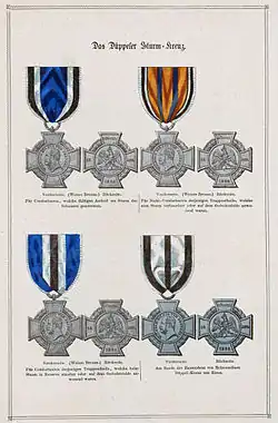 The Düppel Storm Cross (German: Düppeler-Sturmkreuz) was a military medal of the Kingdom of Prussia. The cross was awarded to Prussian participants in the Battle of Dybbøl (Düppeler Schanzen) which took place on 18 April 1864, during the Second Schleswig War. Established by Wilhelm, King of Prussia on 18 October 1864, the cross was initially awarded to combatants and noncombatants who directly participated in the battle. The following year, versions were created for those troops held in reserve at the battle and members of the Johanniter Orden who participated in the battle.[2]