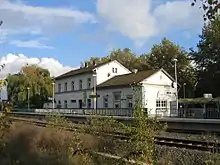 Elsdorf (Rhld)—short for Rhineland—station (meaning at line-kilometre 14.9 of the Düren–Neuss line was referred to in the timetables of the 1970s as Elsdorf (Rhld) West, as the town had another station, Elsdorf (Rhld) Ost (east), from which passenger trains ran to Bergheim (Erft) until 1961 and freight trains until 1967. In the 1980s, the entrance building of Elsdorf (West) was demolished together with signal box “Ent” on Köln-Aachener Straße and was replaced by a small shelter. From 27 May 1995 the passenger traffic was discontinued in the Düren–Bedburg section, on 31 December of the same year, the freight traffic. The line was closed permanently on 2 June 1996. The Düren–Elsdorf section was in the area of today's Hambach lignite mine and was therefore dredged. The Elsdorf–Bedburg section was initially still used for freight, bit it later closed due to lack of demand and dismantled. The site of the station is now a parking area. The former route through Elsdorf is now dismantled and will in future be converted into a park for cyclists and walkers. Part of the line became the property of the Elsdorf sugar factory.