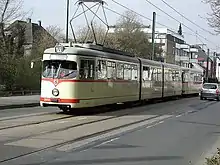 By 1962 there was a one rail narrow gauge tram from Benrath (beginning in the Paulistraße) via Hilden to Solingen-Ohligs resp. to Haan und Wuppertal-Vohwinkel. This narrow gauge railway tram went beyond Benrath to Düsseldorf, Oberbilker Markt, and formed the so-called Benrather Netz, that was bought by Düsseldorf in 1910, hence before the amalgamation of Benrath. the multiple unit No. 107 of this narrow gauge railway is preserved in the Bergisches Straßenbahnmuseum in Wuppertal-Kohlfurt.