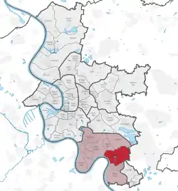 Map of Düsseldorf, showing Benrath (in red) within Borough 9 (in pink) | |