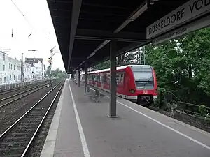 Düsseldorf Völklinger Straße station is a through station in the district of Unterbilk in the city of Düsseldorf in the German state of North Rhine-Westphalia. The station was opened on 29 May 1988[4] on the new line opened by the Prussian state railways on 1 October 1891 between the Hamm Railway Bridge and Gerresheim as part of the construction of Düsseldorf Hauptbahnhof.[5] It has two platform tracks and it is classified by Deutsche Bahn as a category 5 station.[1]