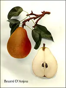 The D'Anjou pear, sometimes referred to as the Beurré d'Anjou or simply Anjou, is a short-necked cultivar of European pear. The variety was originally named 'Nec Plus Meuris' in Europe and the name 'Anjou' or 'd'Anjou' was erroneously applied to the variety when introduced to America and England. It is thought to have originated in the mid-19th century, in Belgium or France.[1]