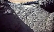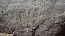 The Dabous Giraffes are neolithic petroglyphs[1] by unknown artists on the western side of the Aïr Mountains in north-central Niger.[2] The carvings are 6 metres (20 ft) in height and consist of two giraffes carved into the Dabous Rock with a great amount of detail. One of the giraffes is male, while the other, smaller, is female. The Dabous Giraffes are located on a sandstone outcrop in the Ténéré desert in the first foothills of the Aïr Mountains, about 110 km north of Agadez and a few kilometres from the Trans-Saharan Highway. They are the largest known animal petroglyphs in the world.[2]