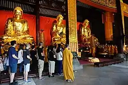 In 1649 during the Qing dynasty (1644–1911), the court ordered Shang Kexi and Geng Jimao to conquer Baiyue (now Guangdong province); Dafo Temple was demolished in the war and became a pile of rubble. In 1661, the King of Vietnam visited the Qing Empire via Guangzhou; a monk from Longzang Temple asked the King to donate wood and the King agreed. In 1663, Shang Kexi donated property to establish the temple and completed it in the following year.[3] The temple had reached an unprecedented heyday in that time. There were three copper statues of Buddha situated in the Mahavira Hall; the statues were 6 metres (20 ft) high and weighed 10 tonnes (9.8 long tons; 11 short tons), and were the largest statues in the Lingnan Region. So the temple was renamed Dafo Temple (大佛寺). In the middle of the Kangxi period, Master Zile (自乐禅师) came to the deserted Dafo Temple and invited Master Zhengmu (正目禅师), abbot of Haichuang Temple to serve as its abbot. In 1733, the Yongzheng Emperor issued a decree to rectify Buddhism. The Zhifu (magistrate) of Guangzhou, Liu Shu (刘庶), chose Dafo Temple as the place of announcing the imperial decree. He erected Baoyu Pavilion (宝御亭), Hall of Skanda, Hall of Sangharama and the Monk's House in the temple. Dafo Temple had been praised as one of the "Five Largest Temples of Guangzhou", alongside Guangxiao Temple, Hualin Temple, Haichuang Temple and Changshou Temple. In 1839, Lin Zexu, the imperial commissioner, set up the headquarters of the collection of opium smoking (收缴烟土烟枪总局) in Dafo Temple. During the Taiping Rebellion (1851-1861), the government of Guangdong occupied the Monk's House and set up the Pacify Bureau (善后局). Only three monks lived in the temple.[1]