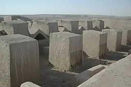 Dahan-e Gholaman is the largest Achaemenid site in all of eastern Iran.[2] Some 27 structures aligned roughly in a straight line running SW to NE along the northern edge of the site were excavated by the Italian archeologist U. Scerrato in 1962–1965 and by the Iranian archeologist S. M. S. Sajjadi in 2000–2005. Further geophysical and surface exploration in 2007–2011 revealed the outline of another monumental building situated 2 km south of the northern complex of buildings.[3] Several of the larger structures excavated or detected at Dahan-e Gholaman have regular rectangular or square plans and bear comparison with the palatial buildings and audience halls of the Achaemenid royal residences at Pasargadae and Persepolis, as well as Dasht-e Gohar.[4] One of the structures has been identified as a religious building, its three altars possibly dedicated to the leading Persian gods Ahura Mazda, Anahita, and Mithra.[5]
