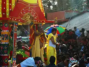 Dahuka boli (Odia: ଡାହୁକ ବୋଲି, also "Dahuka gita" (ଡାହୁକ ଗୀତ)) are poetic recitations which Dahukas (or Ratha bhanda), the charioteer who recite during the Rath Yatra in Puri, Odisha. Ratha Yatra being a symbolic expression of fertility and Life cycle, these "boli" sung by the Dahuka contain bawdy songs. It is believed that unless the Dahuka boli is sung 'Ratha' doesn't move.[1] These songs are sung publicly without any kind of hold on the lyrics.[2] Dahuka controls the movement of Ratha during the festival.[3][4] This tradition is the remnant of Vajrayana Buddhism in Odisha and the lyrics bear the signature of the Vajrayana Buddhist poetry. The Dahukas are believed to be the descends of the famous 84 Mahasiddhas.[5]