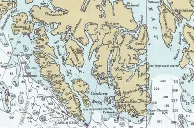 Cape Muzon, the southernmost point of the island, is the western terminus, known as Point A, of the A–B Line, which marks the marine boundary between the state of Alaska and the Canadian province of British Columbia, per the position of the Canadian government on the decision of the arbitration tribunal under the Alaska Boundary Treaty of 1903.[6] This line is also the northern boundary of the waters known as the Dixon Entrance. Cape Muzon was established as the "point of commencement" of the international boundary between Russia and British North America in the Anglo-Russian Convention of 1825.[3] The United States Coast and Geodetic Survey charts produced in 1884 and 1894–95 laid down the boundary line with Canada from Cape Muzon through Dixon Entrance and Portland Canal.[3] In its decision on the delimitation of the disputed Alaska Panhandle boundary, the six-judge 1903 Court of Arbitration unanimously agreed that Cape Muzon was the initial point of the boundary[7] and designated Point A as one endpoint of the A–B Line.[3]