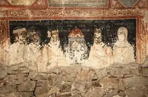 Holy Apostles is a small reproduction of the katholicon (main church) of Nea Moni, being richly decorated outside with brick patterns. The interior is completely covered with frescoes painted by Antonios Kenygos of Crete, in 1665. An inscription over the main entrance of the church tells us that monk Symeon of the Damalas family, who eventually became the metropolitan bishop of Chios, raised the church "from its foundations" in 1564.[43] This most likely refers to an extensive renovation, since its architectural and morphological features indicate that it was constructed in the middle of the 14th century.
