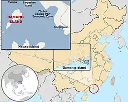 Damang Island (alternatively romanized as Damang Dao,[1] Damang,[2] Taimong,[3] Ta-mang,[4] Ta-wang[5]) is an uninhabited island off the southern coast of Guangdong province in the People's Republic of China. It is located in the Pearl River estuary, South China Sea, 6 kilometres (3.7 miles) west of the Zhuhai Gaolan Port Economic Zone, 4.5 kilometres (2.8 miles) north of Hebao island and approximately 100 km West-Southwest of Hong Kong.