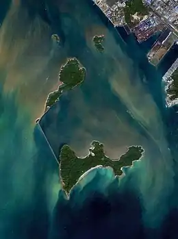 ![]() Damang Island (top) in 2021. Breakwaters connecting the island and Hebao Island (bottom) was completed by 2012. | |