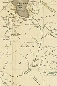 In 1531, Damot was conquered by Imam Ahmad ibn Ibrahim of Adal who then appointed Gasa Umar as its governor.[7] Damot warriors participated in the early battles against Adal but one of the Adalite generals sneeringly dismissed the participation of Damot soldiers, declaring them to be no more than slaves capable of tilting the land, cutting the trees and carrying wood, but were entirely ignorant of warfare.[8] Following the death of Imam in 1543, Emperor Gelawdewos would eventually restore imperial rule over the province. Emperor Sarsa Dengel also visited the province on numerous occasions and many Damot warriors served in his armies and were engaged, for example against the Oromos in Waj in 1572.[9]