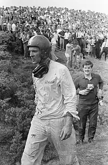 Gurney's first major break occurred in the fall of 1957 when he was invited to test Frank Arciero's Arciero Special. It was powered by a 4.2-litre reworked Maserati engine with Ferrari running gear, and a Sports Car Engineering Mistral body.[10] This ill-handling brute of a car was very fast, but even top drivers like Carroll Shelby and Ken Miles had found it difficult to handle. He finished second in the inaugural Riverside Grand Prix (behind Shelby), beating established stars like Masten Gregory, Walt Hansgen and Phil Hill. This attracted the attention of famed Ferrari North American importer Luigi Chinetti, who arranged for a factory ride for the young driver at Le Mans in 1958. Gurney, teamed with fellow Californian Bruce Kessler, had worked the car up to fifth overall and handed over to Kessler, who was then caught up in an accident. This performance and others earned him a test run in a works Ferrari, and his Formula One career began with the team in 1959. In just four races that first year, he earned two podium finishes, but the team's strict management style did not suit him. In 1960 he had six non-finishes in seven races behind the wheel of a factory-prepared BRM. At the Dutch Grand Prix, at Zandvoort, a brake system failure on the BRM caused the most serious accident of his career, breaking his arm, killing a young spectator and instilling in him a longstanding distrust of engineers. The accident also caused him to make a change in his driving style that later paid dividends: his tendency to use his brakes more sparingly than his rivals meant that they lasted longer, especially in endurance races.