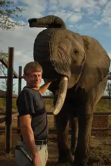 ![]() Dan Koehl and African savanna elephant bull "Bonniface" at Elephant Experience, Victoria Falls, Zimbabwe (2005). | |