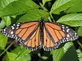 - Danaus plexippus (Linnaeus, 1758) ( original name = Papilio plexippus Linnaeus, 1758; = misippiformis Meuschen, 1781; = archippus Fabricius, 1793; = menippe Hübner, 1816; = megalippe Hübner, 1826; = leucogyne Butler, 1884; = fumosus Hulstaert, 1886; = pulchra Strecker, 1900; = nigrippus Haensch, 1909; = americanus Gunder, 1927; = nivosus Gunder, 1927; = curassavicae Fabricius, 1938; = portoriciensis Clark, 1941; = tobagi Clark, 1941; = disjuncta Dufrane, 1948; = bipunctata Dufrane, 1948; = obliterata Dufrane, 1948)