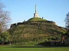 The first construction on the Dane John site was a burial mound, built during the Roman occupation of Canterbury between the 1st and 4th centuries AD.[1] In 1066, Canterbury was occupied by the Normans.[2] William the Conqueror instructed that a castle was to be built in the city; it was built on the south side of the city using the Dane John mound and formed part of the circuit of defence, with property being destroyed to make room for it.[3] This timber motte and bailey castle was later abandoned and the second Canterbury Castle was built just to the north in 1123.[4]
