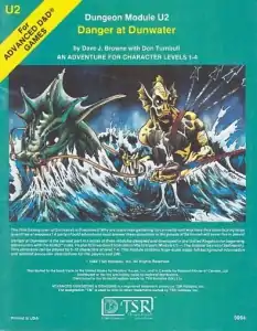 Danger at Dunwater is an adventure module for the Advanced Dungeons & Dragons (AD&D) fantasy roleplaying game, written by Dave J. Browne with Don Turnbull The module was first published by TSR, Inc. in 1982 and contains a 32-page adventure set in the World of Greyhawk campaign setting. It was designed for 6-10 characters of level 1-4.[1]