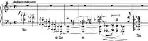 The piece is divided into two main subjects. The first, a chromatic theme in D minor, typifies the wailing of souls in Hell. D minor is a common key for music relating to death, as evidenced by other compositions such as Liszt's Totentanz[5] and the statue scene of Wolfgang Mozart's Don Giovanni. The first theme also heavily uses the tritone (augmented 4th or diminished 5th); this interval was known as the Devil's interval (or "Devil in music") and further reinforces the hellish imagery. The second theme is a beatific chorale in F-sharp major, derived from the first, which represents the joy of those in Heaven.[6] The key is also symbolic here, being the signature for other uplifting works of Liszt's, including Benediction of God in Solitude (part of Harmonies poétiques et religieuses)[7] and Les Jeux d'eaux à la Villa d'Este (Années de pèlerinage, vol. 3, no. 4).[8] The secondary theme may also represent Beatrice, as it is interspersed within chromatic areas, similar to the character's appearances in hell. The piece ends with a rapid chromatic octave section that when played at speed seems to split into three distinct themes, reflecting Satan's three faces in Dante's Inferno.