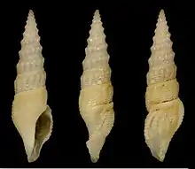 (Original description) The shell has an elongate-conic shape. It is pale yellow, with a faint brown band encircling the whorls a little anterior to the sinal sulcus at the summit. The protoconch contains 1.5, smooth, well rounded whorls. The postnuclear whorls are well rounded. They are marked on the first three turns by a submedian row of distantly spaced cusps. On the succeeding whorls these cusps become elongated into ribs that extend from the sinal sulcus at the summit anteriorly to the suture, becoming weaker toward the suture. Of these ribs, 10 occur upon the first whorl, 12 upon the second and third, and 14 upon the remaining whorls except the body whorl, which has 16. The spaces that separate these ribs are a little less wide than the ribs. In addition to this there are numerous fine lines of growth, which slope retractively in the sulcus at the summit and protractively anteriorly. The sulcus at the summit is without spiral sculpture, whereas in the region anterior to it both ribs and intercostal spaces are crossed by rather strong, low, rounded, spiral cords, of which four occur upon the fifth to seventh, five upon the eighth, seven upon the ninth, and eight upon the body whorl between the summit and suture. These spiral cords are more or less equal. The suture is rendered conspicuous by the slightly sloping shoulder of the summit of the whorls. The periphery is well rounded. The base of the shell is short, marked by the feeble continuation of the axial ribs and by seven spiral cords which are of unequal strength. The columella is short and stubby with a strong, broad fold opposite the varix on the outer lip which is separated from the parietal wall by a concave groove. The shell is marked by seven rather broad spiral cords, which are separated by narrow channels. The aperture is short, decidedly channeled anteriorly and posteriorly, the posterior channel being deeply notched and at the summit of the shell. There is a broad varix half a whorl behind the aperture. The outer lip is protracted between the sinus and the basal portion. The inner lip is appressed to the columella as a heavy callus which extends over the parietal wall.[2]