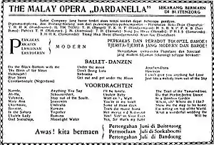 Their plays were presented in Malay and often adapted works by other writers.[3] Some works, such as those by Victor Ido, were translated from the original when adapted for stage.[3] Dardanella and its contemporary rival Miss Riboet's Orion – established a year before – were some of the first travelling troupes in the Indies to use original works; earlier bangsawan and stambul troupes had used broad outlines of foreign works.[15][10] The two were the most popular troupes from the Indies of their time.[10]
