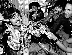 Following an accident at Friar Park when a tractor drove over his foot, Harrison required a walking stick during his brief promotional visit to the US. He made fun of his predicament by using a wheelchair when departing from Heathrow.[102] On 8 March,[103] at the Dark Horse Records offices in Los Angeles, Harrison gave his first US press conference since the start of his 1974 tour.[104] In journalist Rip Rense's later description, he was "promptly surrounded – and almost suffocated" by the reporters[105] as microphones were thrust in his face.[104][nb 9] Harrison's lightheartedness extended to the usual questions about when the Beatles might re-form;[31] the Associated Press photo from the event showed him holding his hands up to his ears in response.[103] Dismissing the recent multi-million-dollar offers for a reunion concert, he said, "The Beatles can't save the world. I mean, we'll be lucky if we can save ourselves."[105][106] When a reporter asked whether "something less than a full reunion" was likely, Harrison suggested they could meet for a cup of tea and televise the proceedings via satellite.[107] He added that he and his former bandmates would have a "great time" together, and "the only thing that would spoil it would be all of you with the cameras and microphones!"[108]
