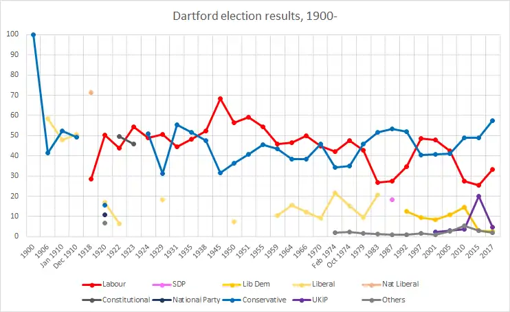 In the early 20th century, the Dartford constituency was very much a bellwether. Dartford's results later shifted towards the left: in a by-election in 1938 and then general elections from 1951 to 1959, a Labour MP was elected against the national result. Since 1964, however, Dartford has alternated between Labour and the Conservatives in line with the national result, and thus has served as a bellwether again.