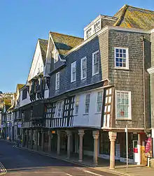 The town contains many medieval and Elizabethan streetscapes and is a patchwork of narrow lanes and stone stairways. A significant number of the historic buildings are listed.[17] One of the most obvious is the Butterwalk, built 1635 to 1640. Its intricately carved wooden fascia is supported on granite columns. Charles II held court in the Butterwalk whilst sheltering from storms in 1671 in a room which now forms part of Dartmouth Museum.[18] Much of the interior survives from that time.