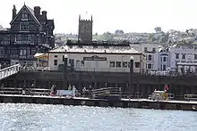 No railway has ever run to Dartmouth, but the town does have a railway station,[44] opened on 31 March 1890 to replace the original facility on the pontoon,[45] although it is now a restaurant. In fact Dartmouth Railway Station was built while the line from Paignton to the River Dart was still being built, anticipating a bridge across the river being built near the present Greenway Halt. The railway line to Kingswear was opened in 1864. As a result of shortage of capital, a deviation from the original scheme to run the line from Churston to Greenway with a steamer service to Dartmouth was proposed, but defeated in Parliament. It had been suggested that this could, at a later date, be used as a jumping off point for a bridge to the west bank of the Dart and a line direct to Dartmouth.[46] In 1900, a Light Railway scheme was proposed for a crossing of the Dart near Maypool to join another line from Totnes and then proceed to Kingsbridge and Yealmpton, with a branch to Salcombe.[47] This was also defeated by lack of funds. The railway terminated at a station called "Kingswear for Dartmouth" (now on the Dartmouth Steam Railway) and a ferry took passengers across the river to the station at Dartmouth railway station, which had a dedicated pontoon. British Railways formally closed the line to mainline passenger trains in 1973, but it immediately re-opened as a heritage line and has run as one ever since.